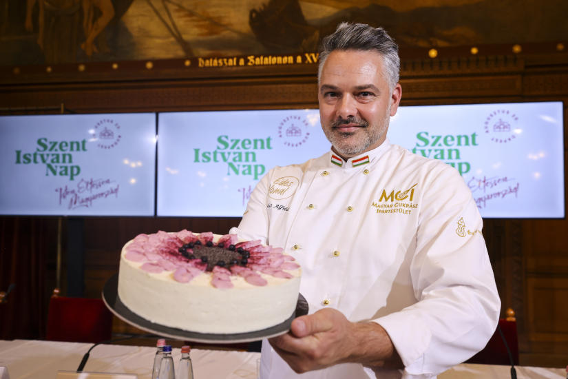 A fotón Kovács Alfréd cukrász bemutatja Magyarország tortáját az államalapítás és az államalapító Szent István király ünnepének rendezvényeit beharangozó sajtótájékoztatón az Országház Vadásztermében 2024. augusztus 1-jén. Hegedüs Róbert / MTI