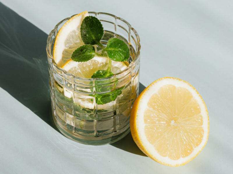 Hozzávalók: 20 cl hűtött mentatea, 3 cl frissen facsart citromlé, 3 cl juharszirup, fél citrom, friss menta és jégkocka