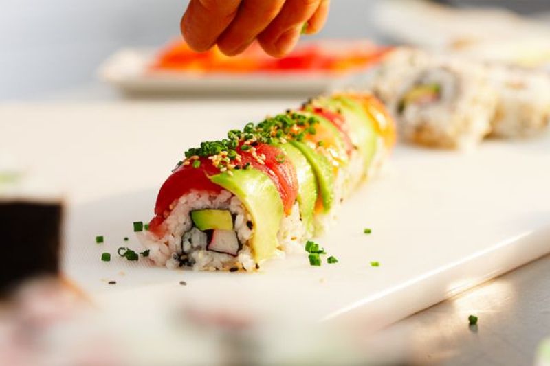 Az avokádót és a halat szeletnyi széles, 5-6 cm hosszú darabokra vágjuk, és a tekercsek köré illesztjük. A maradék szezámmaggal és aprított snidlinggel megszórva tálaljuk. Pácolt gyömbért, wasabi pasztát és szójaszószt kínálhatunk mellé.