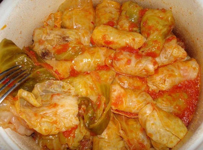 Ha a tekercsek készen vannak, egy alkalmas méretű fazék aljába 2 ujjnyi vastagon metéltre vágott káposztát teszünk, erre fektetjük a tekercseket, majd ha azok elfogytak, a tetejére ismét laskára vágott káposzta kerül.
