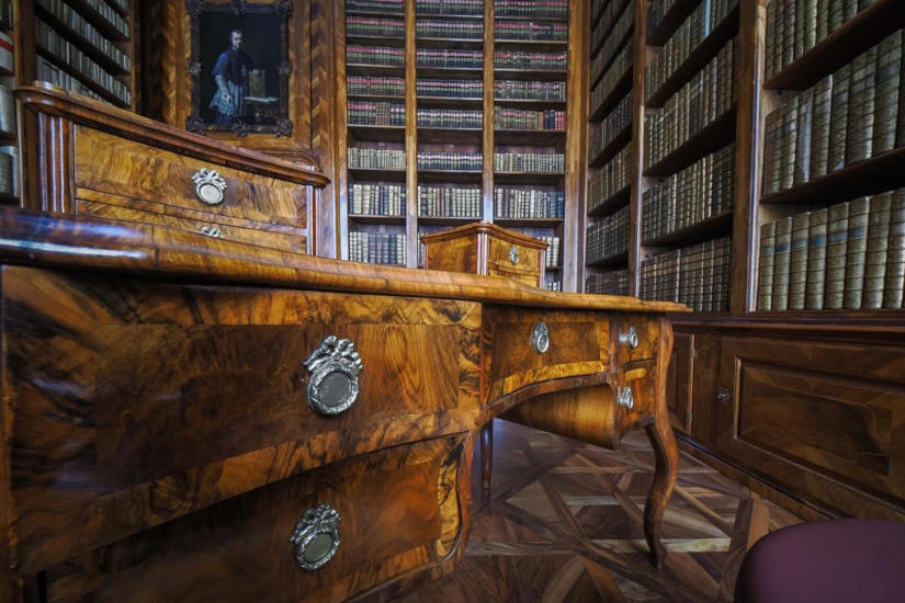 A könyvtár bejárata fölött Koller Ignác portréja látható, amelyet Franz Anton Palko osztrák festőművész készített. A terem meghatározó eleme az eredeti, aranyozott hársfa csillár, amelyet soha nem alakítottak át elektromos világításúvá. A döntés mögött a történeti hitelesség megőrzésének szándéka áll, amely a teljes restaurálási folyamatot végigkísérte.