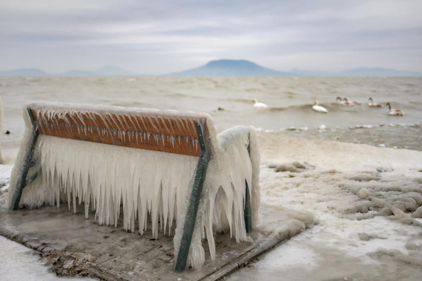 A fotón: jég borít egy padot a Balaton partján, a balatonfenyvesi szabadstrandon 2024. január 9-én.