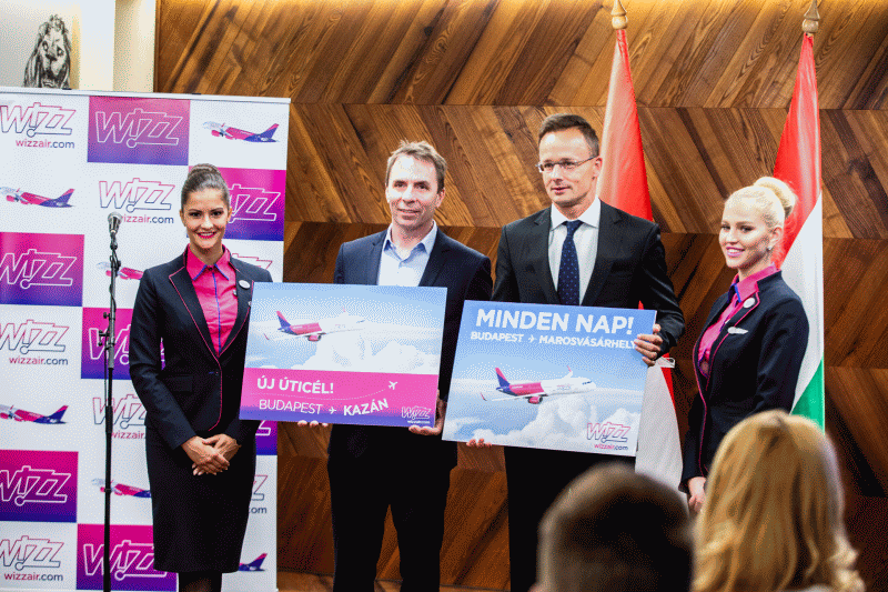 Szijjártó Péter külgazdasági és külügyminiszter a sajtótájékoztatón elmondta: „Változó világunkban folyamatosan nő a gyors és hatékony összeköttetések jelentősége. A magyar kormány számára ezért különösen fontos, hogy olyan együttműködési lehetőségeket keressen, amelyek elősegítik a nemzeti érdek érvényesülését. Ilyen együttműködést folytatunk a Wizz Airrel. Nemzeti érdek, hogy a határon túli magyar közösségekkel könnyű és akadálymentes legyen a kapcsolattartás, és az is, hogy gyors és hatékony összeköttetésekkel segítsük elő a külgazdasági sikereket. Ennek jegyében örömmel jelentjük be, hogy októbertől naponta közlekedő repülőjárat köti össze Budapestet Marosvásárhellyel, még élőbbé téve a kapcsolatot Marosvásárhely és térsége, illetve a magyar főváros között. Másik bejelentésünk, hogy közvetlen járat indul a magyar fővárosból Kazánba. Az Európai Unió tagállamai közül csak Magyarország rendelkezik főkonzulátussal a Tatár Köztársaság fővárosában, és gazdasági sikerének köszönhetően a régió fontos felvevőpiaca a magyar mezőgazdaságnak és élelmiszeriparnak, illetve a magyarországi olajimport szempontjából is fontos szerepet játszik.”