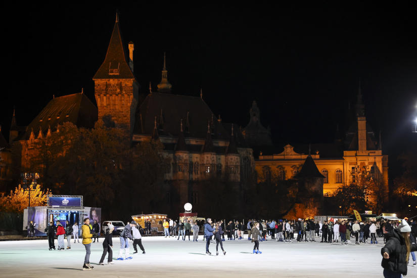 A fotón: korcsolyázók a Városligeti Műjégpályán 2023. november 20-án, amikor megkezdődött a korcsolyaszezon Magyarország egyik legnépszerűbb télisport-helyszínén, a Városligetben. Fotó: Hegedüs Róbert / MTI