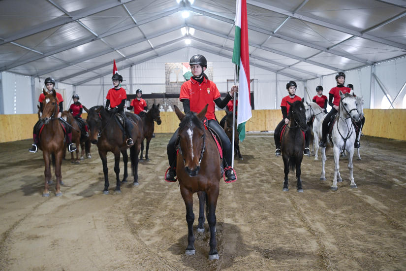 A fotón lovasok a szlovák-magyar határtérségben 1,5 milliárd forintból megvalósult lovas és kerékpáros projekt átadásán a pomázi Magyar Vár Táborban 2024. április 23-án. A Bike and Horse riding projekt a Magyar Vár Alapítvány és a Vág-Duna-Ipoly Regionális Társulás közös, határon átnyúló vállalása. A fejlesztés az Interreg Szlovákia-Magyarország Együttműködési programon keresztül valósult meg, az Európai Regionális Fejlesztési Alap társfinanszírozásával. Fotó: Koszticsák Szilárd / MTI