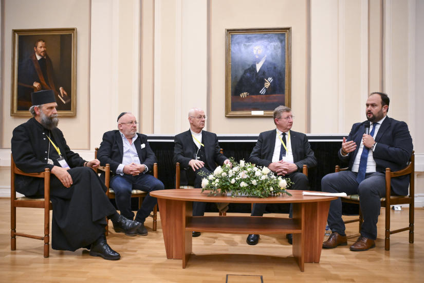 A fotón Nacsa Lőrinc, a Nemzeti Vallásturizmus Intézkedési Terv megvalósításához szükséges intézkedések koordinációjáért felelős miniszteri biztos (jobbra) beszél a II. Nemzeti Vallásturizmus Fórum megnyitója utáni kerekasztal beszélgetésen a Debreceni Református Kollégium dísztermében 2023. november 27-én. Mellette Kocsis Fülöp, a Hajdúdorogi Főegyházmegye érsek-metropolitája, Horovitz Tamás, a Debreceni Zsidó Hitközség elnöke, Ternyák Csaba, a Magyar Katolikus Egyház Egri Főegyházmegye érseke és Fekete Károly, a Tiszántúli Református Egyházkerület püspöke (balról jobbra). Fotó: Czeglédi Zsolt / MTI