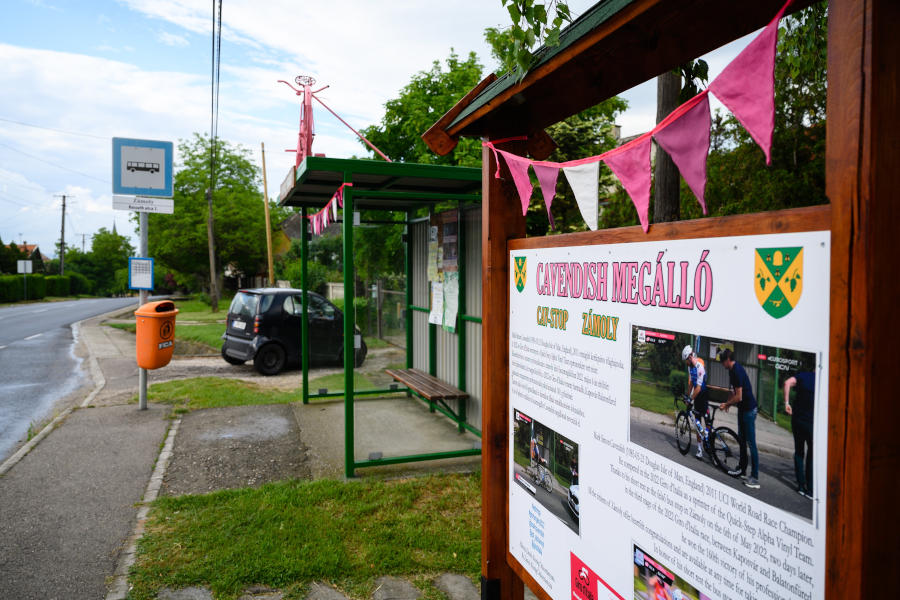 Mark Cavendish brit kerékpáros ottjártára emlékező buszmegálló Zámolyban. A Giro d’Italia országúti kerékpáros körverseny Budapest és Visegrád közötti 195 kilométeres nyitóetapján, 2022. május 6-án a brit versenyző ebben a zámolyi buszmegállóban cserélt kerékpárt, ennek állít emléket a megálló.